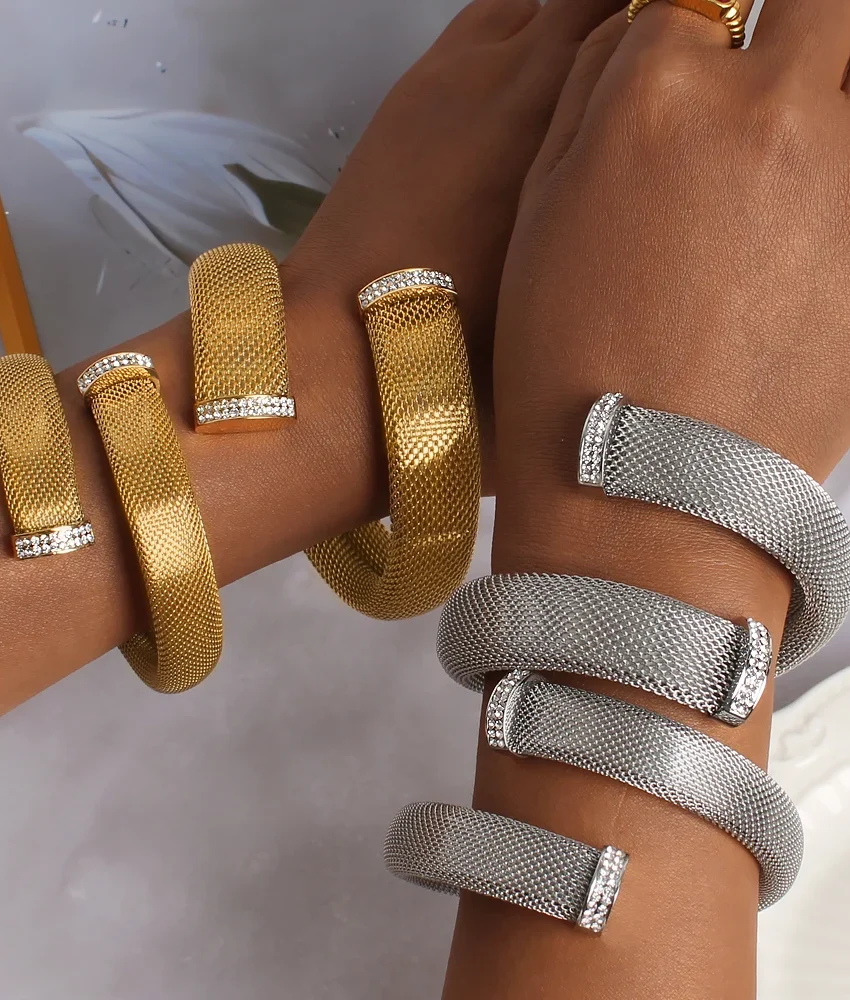 Chunky Thick Mesh Stainless Steel Cuff Bangle for Women Charm AAA Zirconia Inlaid Bracelet Tarnish Free