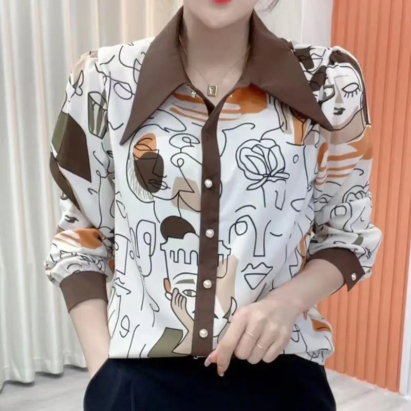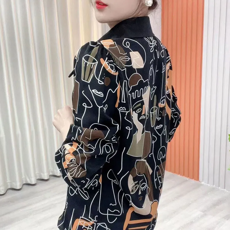 Female Clothing Fashion Abstract Line Printed Blouse Commute Single-breasted Casual Korean Loose Spring Autumn Long Sleeve Shirt