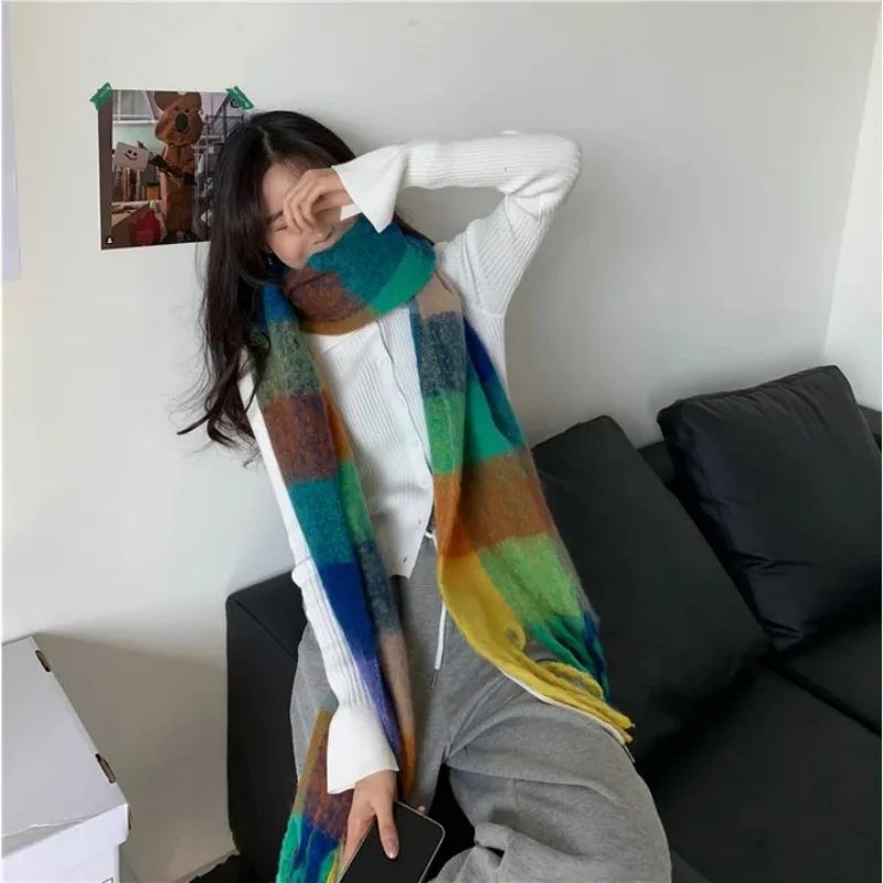 Luxury Brand Women Plaid Scarf Winter Warm Pashmina Shawls Cashmere Thick Wrap Lady Tassel Blanket Scarves Rainbow Hairy Bufanda