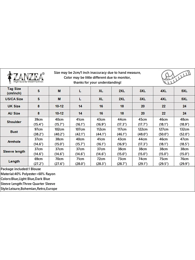 | Package included:1 Blouse Material:40% Polyester+60% Rayon Colors:Blue,Light Blue,Dark Blue Sleeve Length:Three Quarter Sleeve Neckline:Turn-Down-Collar Pattern:Solid Color Buckle chain:Button Cuffs Thickness:Thin Style:Leisure,Bohemian,Retro,Europe Season:Spring,Summer,Autumn,Winter Occasion:Family,Party,Wedding,Holiday,Employment Label: Yes Attentions: 1.The Real Object May Exist Slightly Colors Differences Compared To Images As Different Computers Display.Caution If Minding,Thanks. 2.There Might Be A Manual Measuring 1-3 cm Error.Sorry For Any Inconvenience. 3.Please Prevail On Real Item, Model Images For Reference Only. 4.Attention!!!Please check the size chart carefully before placing the order.